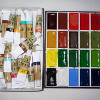 Les Aquarelles se présentent le plus souvent en tubes ou en godets, et plus encore en demi-godet, dans des boites bien pratiques pour peindre dehors.